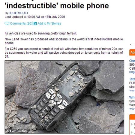 Resiste a temperature estreme (da -20 a +100 gradi), può essere immerso senza problemi in acqua e non teme le cadute accidentali: e’ il telefonino ultra-resistente lanciato dalla casa automobilistica Land Rover, che lo ha definito il primo cellulare indistruttibile al mondo.