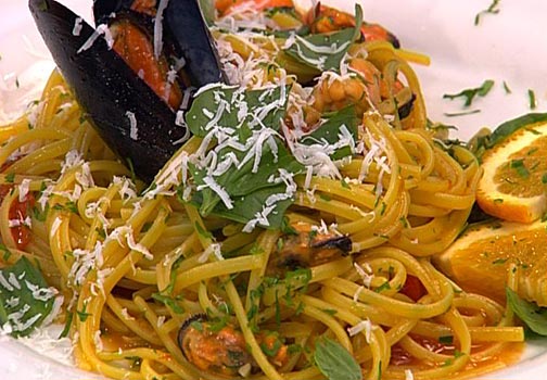 | In una padella aprire le cozze. In due diverse padelle antiaderenti sminuzzare aglio e peperoncino a soffriggere. Calare le cozze in una delle due padelle facendo attenzione all’acqua di cottura delle cozze che deve essere filtrata onde evitare i fastidiosi residui della precedente cottura. Tagliare i pomodori e farli rosolare nella seconda padella, aggiungere poi il sale. Calare la pasta. Nel frattempo aggiungere il brandy alle cozze (lontano dal fuoco). Sciogliere lo zafferano con 1 cucchiaio di acqua di cottura della pasta. Unire alle cozze l’acqua di cottura della pasta e tirare il sugo. Unire i pomodori alle cozze. Aggiungere le bucce di limone alla pasta. Scolare la pasta e mantecarla in padella coperta da un coperchio. Al termine della cottura, saltare e servire. |
